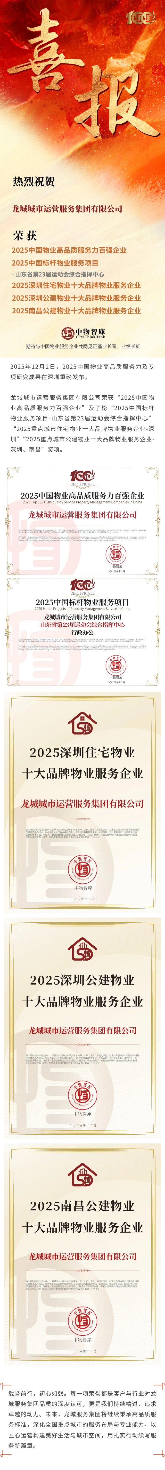 喜报丨龙城服务集团荣登“2025中国物业高品质服务力百强企业”及专项榜单